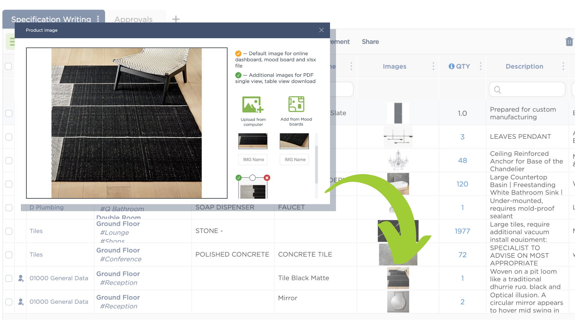 As you can see, these four column types are what allow you to build a truly comprehensive library for your ff&e, finishes, and materials. That means no longer having to store information in separate “containers” like spreadsheets for product details and DropBox folders (or your desktop) for images.