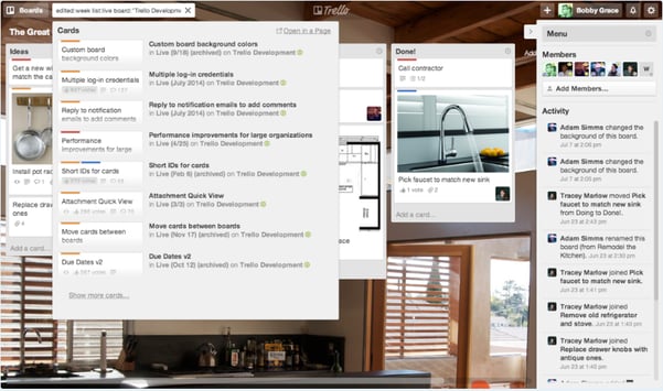 Enter: Trello. It’s a killer app. Trello organizes your projects with neatly put together, completely searchable lists and cards. You can access them from your phone, tablet, or desktop. Open a card and you can start strike up a conversation, upload file attachments, create checklists, add labels and due dates and more. In real time, any member can see the landscape of your project—task-by-task, as its evolving. And when big changes come, Trello will notify everyone who needs to know. Don’t wait for that lumbering weekly meeting.